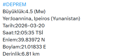 AFAD, Yunanistan’da 4.5 büyüklüğünde depremi açıkladı. Afet ve Acil Durum Yönetimi Başkanlığı(AFAD) tarafından yapılan açıklamaya göre Yunanistan’ın Loannina, Lpeiros bölgesinde 4.5 büyüklüğünde deprem meydana geldiğini duyurdu.